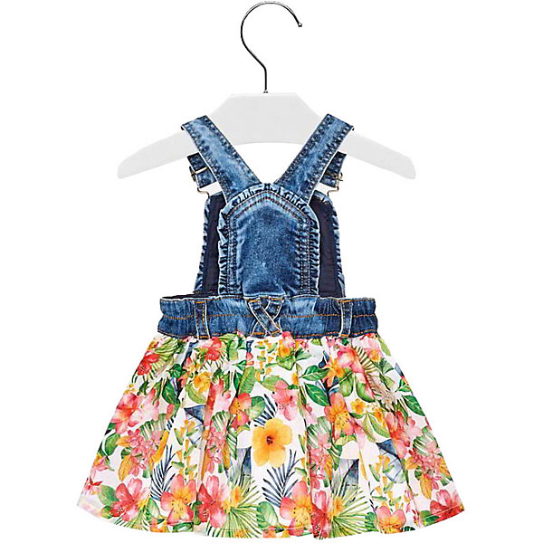 Юбка на бретельках, которые цепляются за пуговички. Верх джинсовой, по низу отрезная ткань в складку и цветочным принтом. Спереди накладной кармашек, украшенный аппликациями. Материал мягкий и дышащий. Совершенно не сковывает движений.