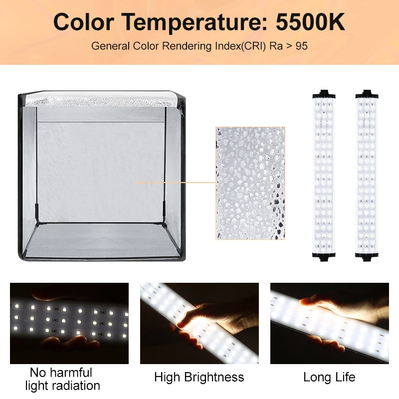 Характеристика:Светодиодный светильник высокого качества, самый высокий CRI≥ 95 может представить наиболее реалистичное изображение объекта.Светильник можно отрегулировать от 10% до 100%, а диммер яркости позволяет лучше контролировать светильник.Переднее окно поддерживает горизонтальную съемку. Верхнее отверстие поддерживает вертикальную съемку на 90 градусов. Палатка может соответствовать вашим различным требованиям к углу съемки.Легко носить и устанавливать: Портативный и складной дизайн позволяет носить его в любом месте. На фото светильник коробка светильник вес, экономия пространства, сжатия устойчивостью и удобный для хранения и настройки.Многофункциональный дизайн: светильник для камеры полностью подходит для смартфонов, камер и видеокамер.Очень подходит для съемки небольших продуктов, таких как цифровые продукты, ювелирные изделия, часы и т. д.Спецификация:Цветовая температура: 5500KЯркость: 10-100%Количество СВЕТОДИОДНЫЙ: 84 шт.Lnput напряжение: 24 ВЭлектрический ток: 1AМощность: 24 ВCRI:≥ 95Средний срок службы: 50000 чВес: около 3 кгРазмер: 40 см * 40 см/16 дюймов * 16 дюймов