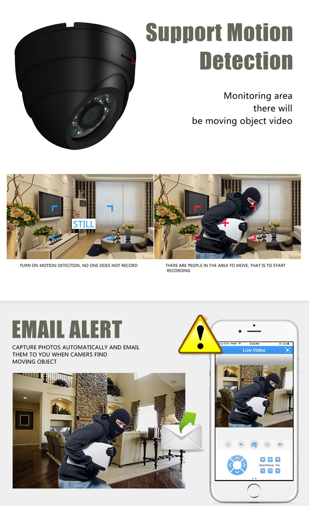 * 1/3 "датчик цветного изображения * AHD 1.0MP 720P с 24 инфракрасными лампами * 3,6 мм/6,0 мм объектив (по умолчанию: 3,6 мм) * Сигнал: PAL / NTSC * Ночное Видение Мин. Светильник: 0 люкс (IR On) * ИК-излучение расстояние: до 30 м * Рабочая температура: -40 °C ~ + 50 °C * Крепление: потолок или стена * Видео разъем: BNC * Разъем питания: RCA 12V DC
