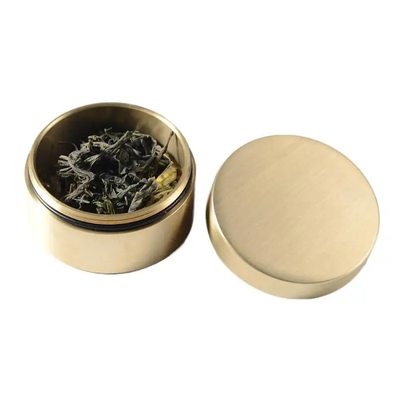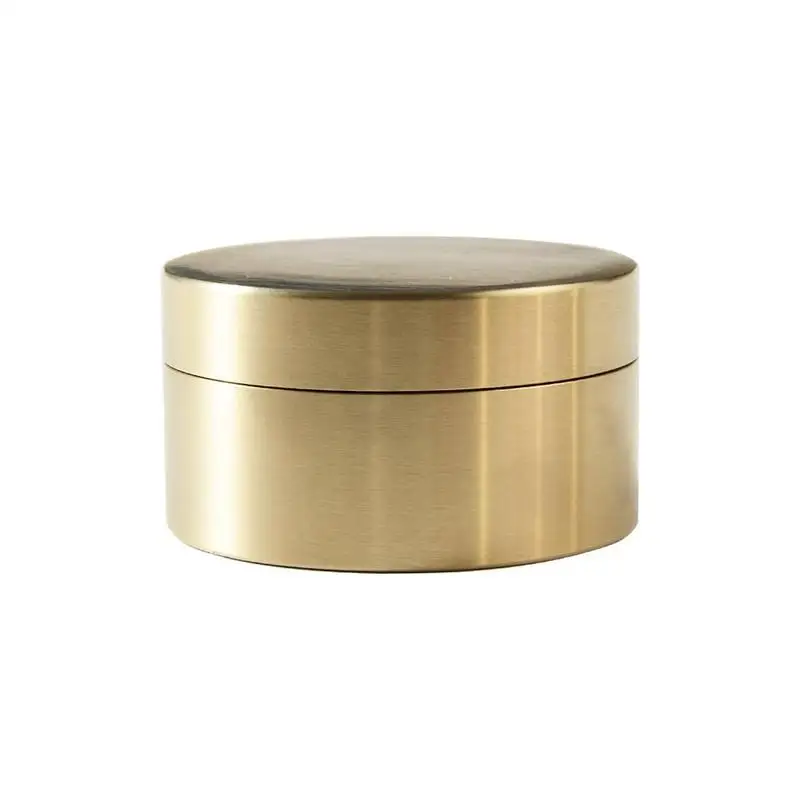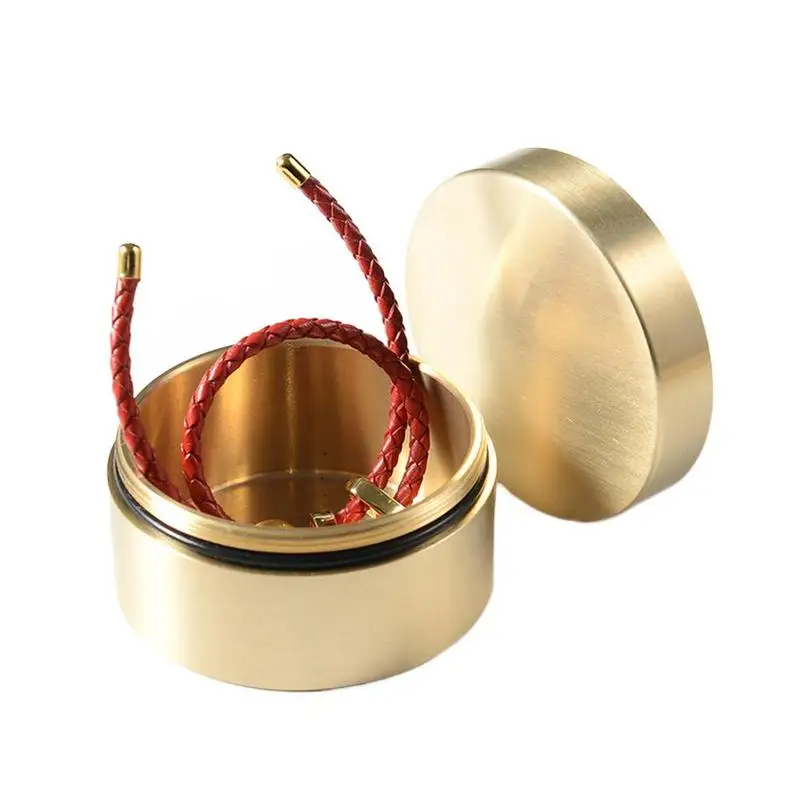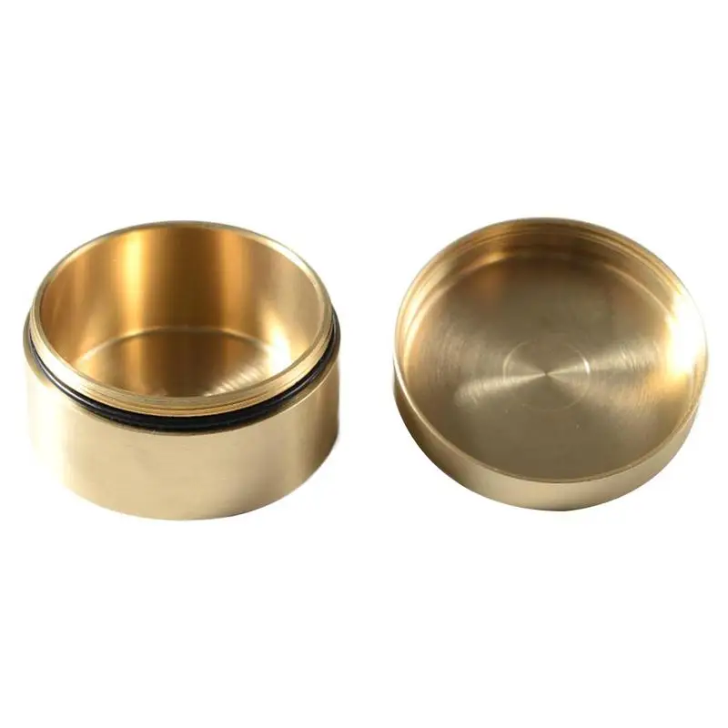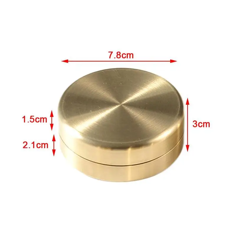 Латунный ящик для хранения (Малый): общая высота 3 см, внешний диаметр 3,9 см, толщина стенки крышки 2 мм, высота крышки 1 см, высота бутылки 2 .. 6 см, внутренний диаметр бутылки 3,1 см, вес нетто 119 г
