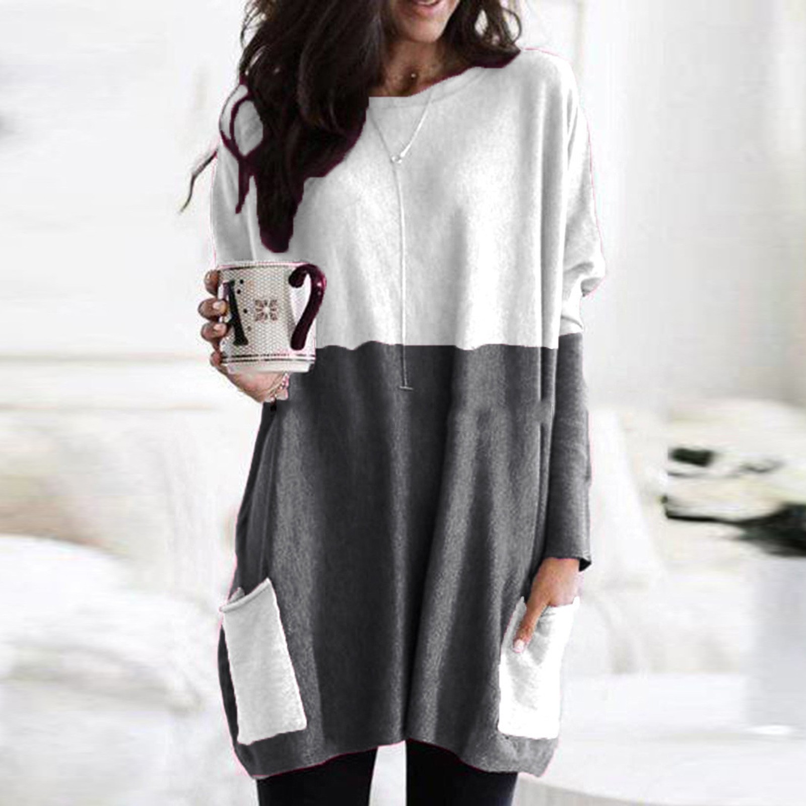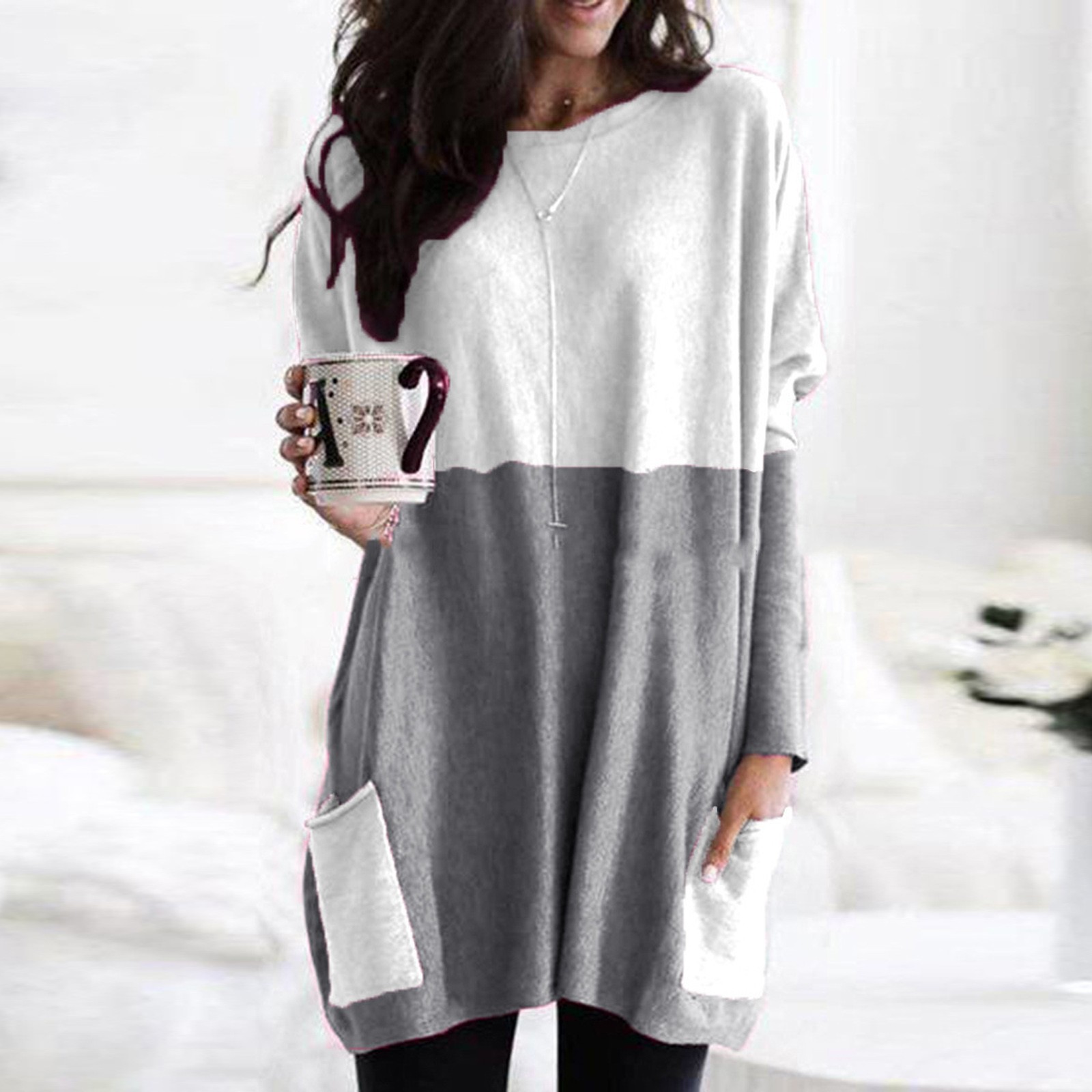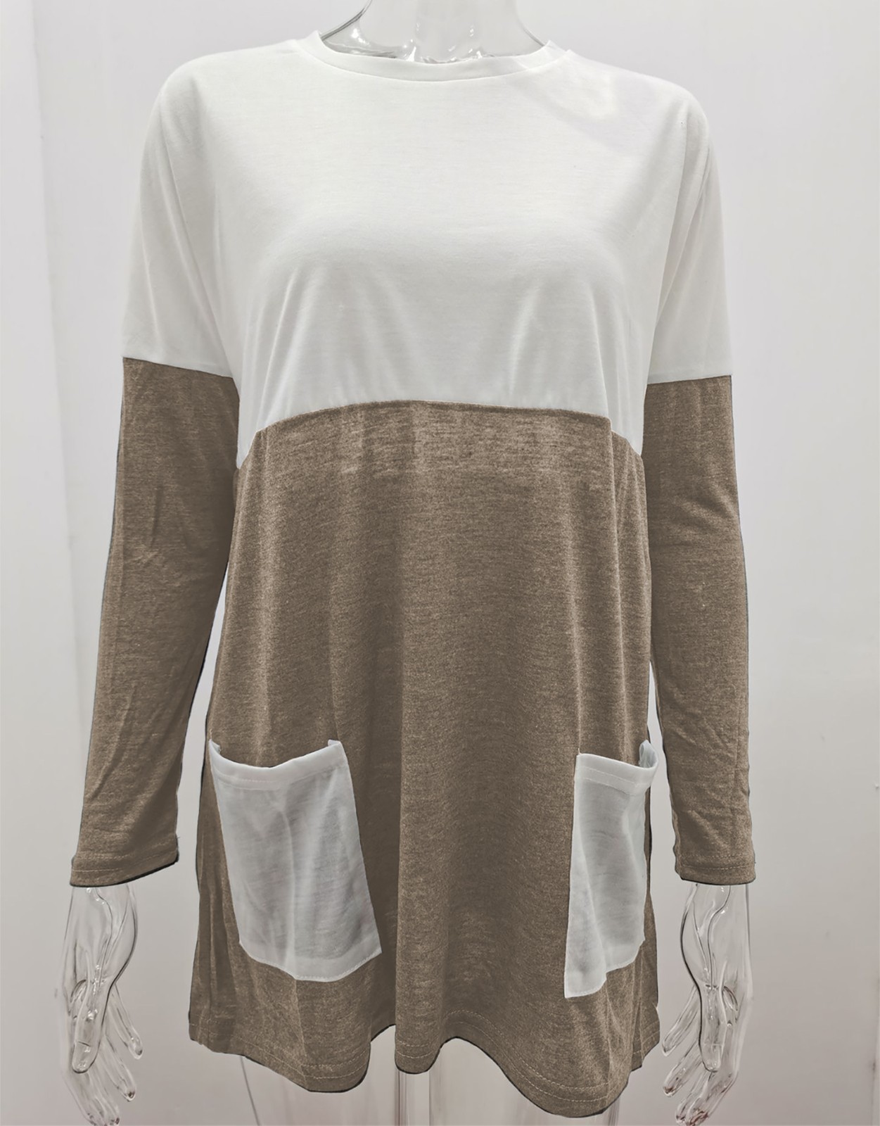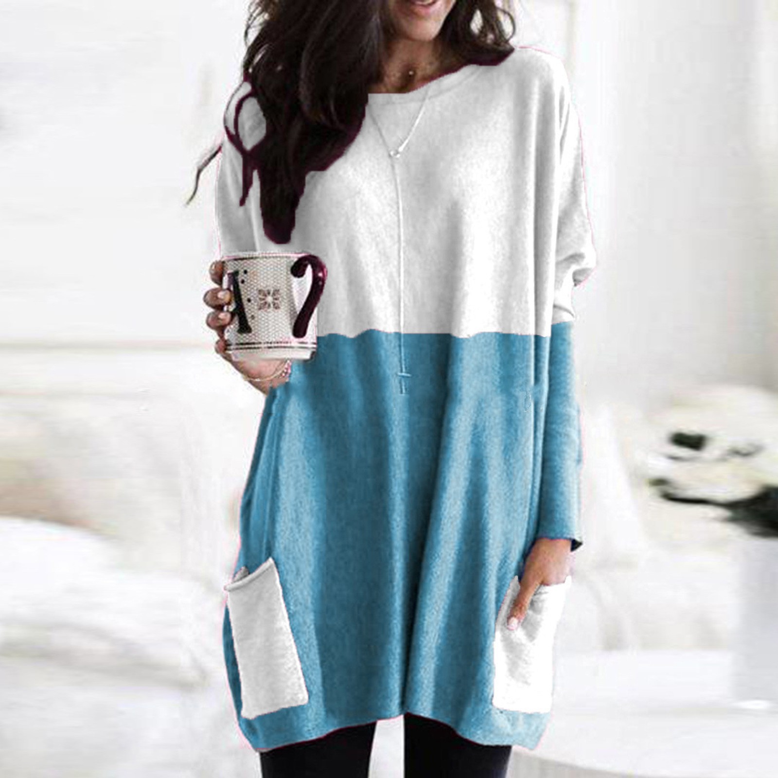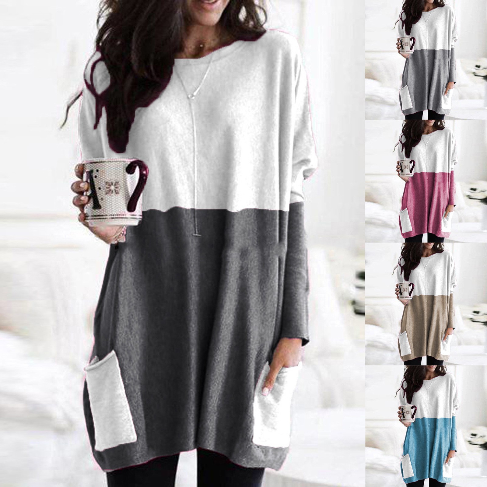 Женские модные повседневные Лоскутные свободные хлопковые топы с длинными рукавами и карманами и круглым вырезом