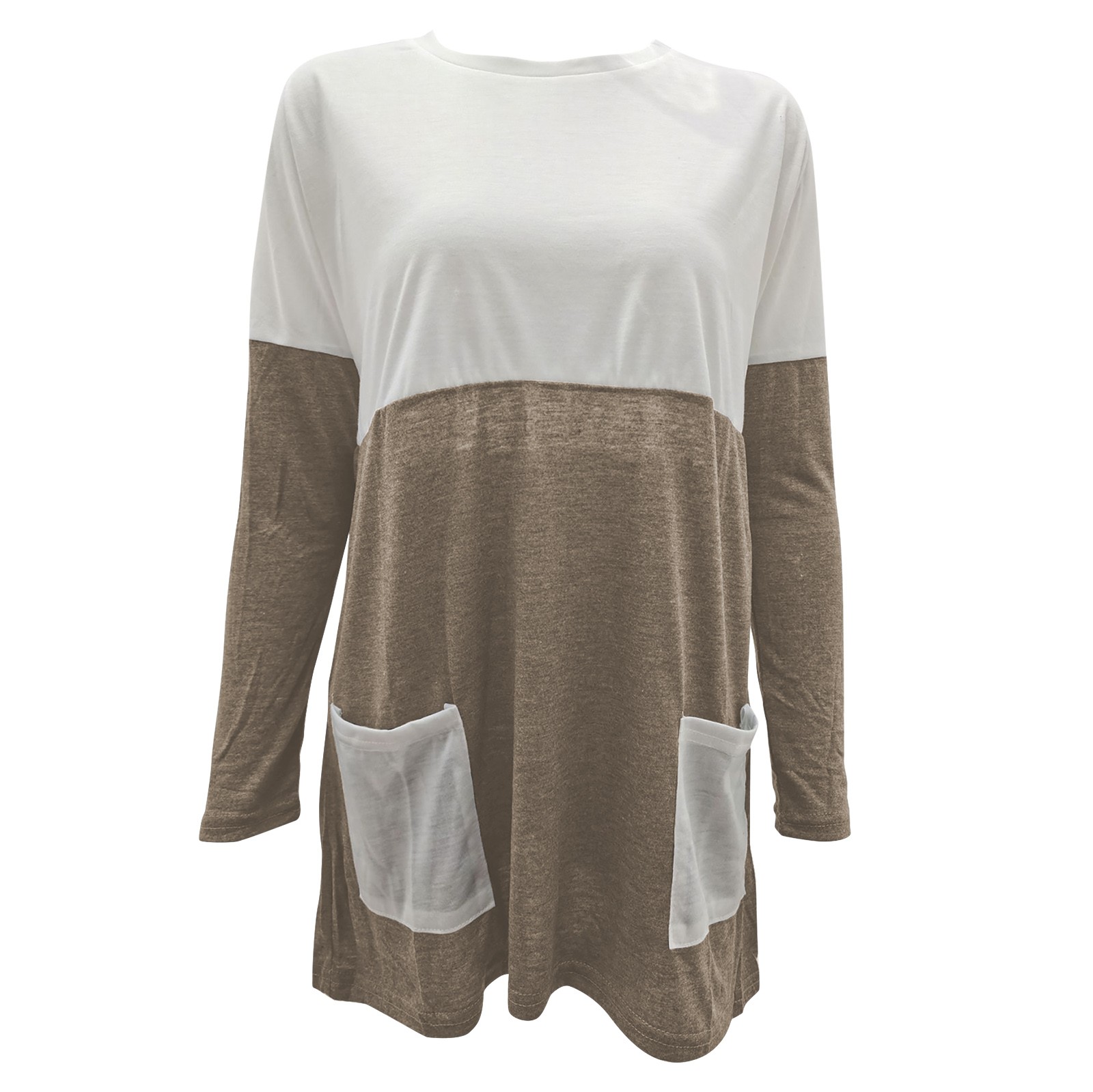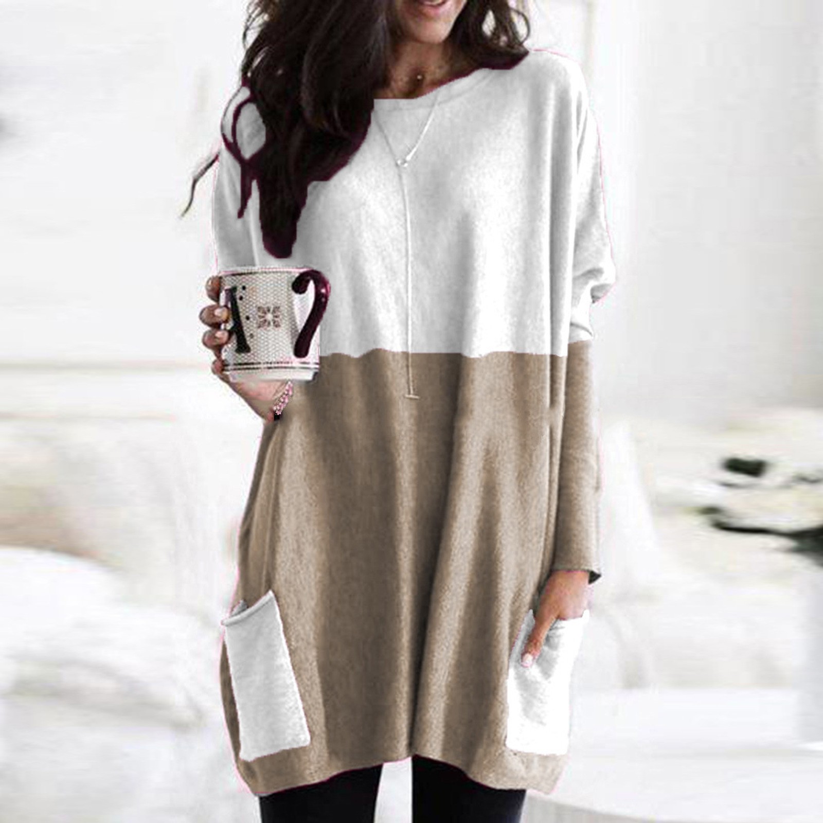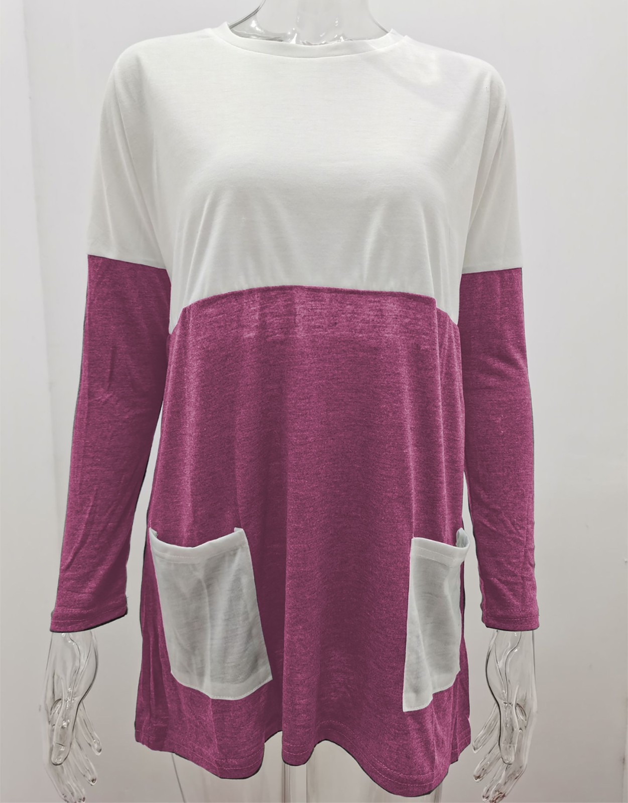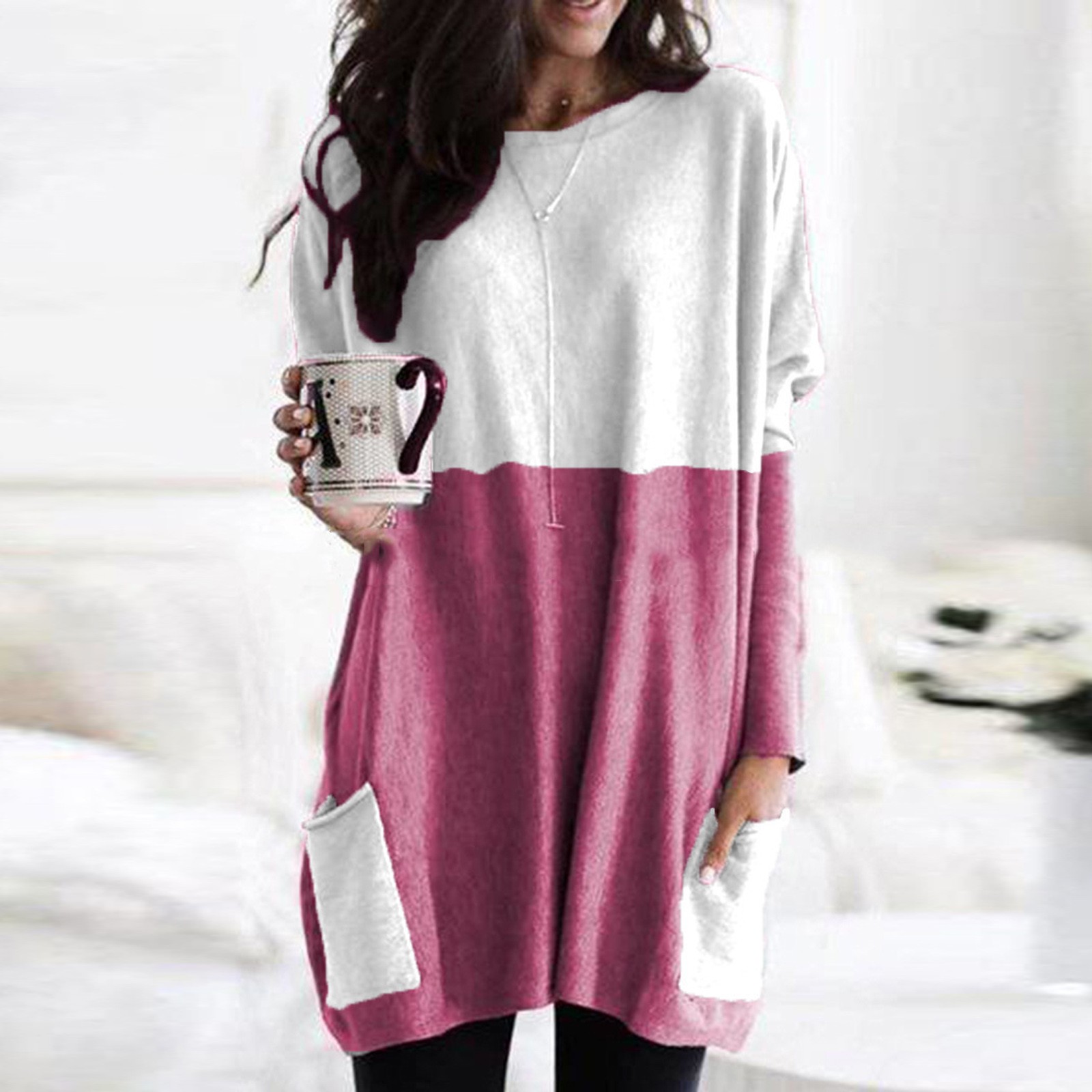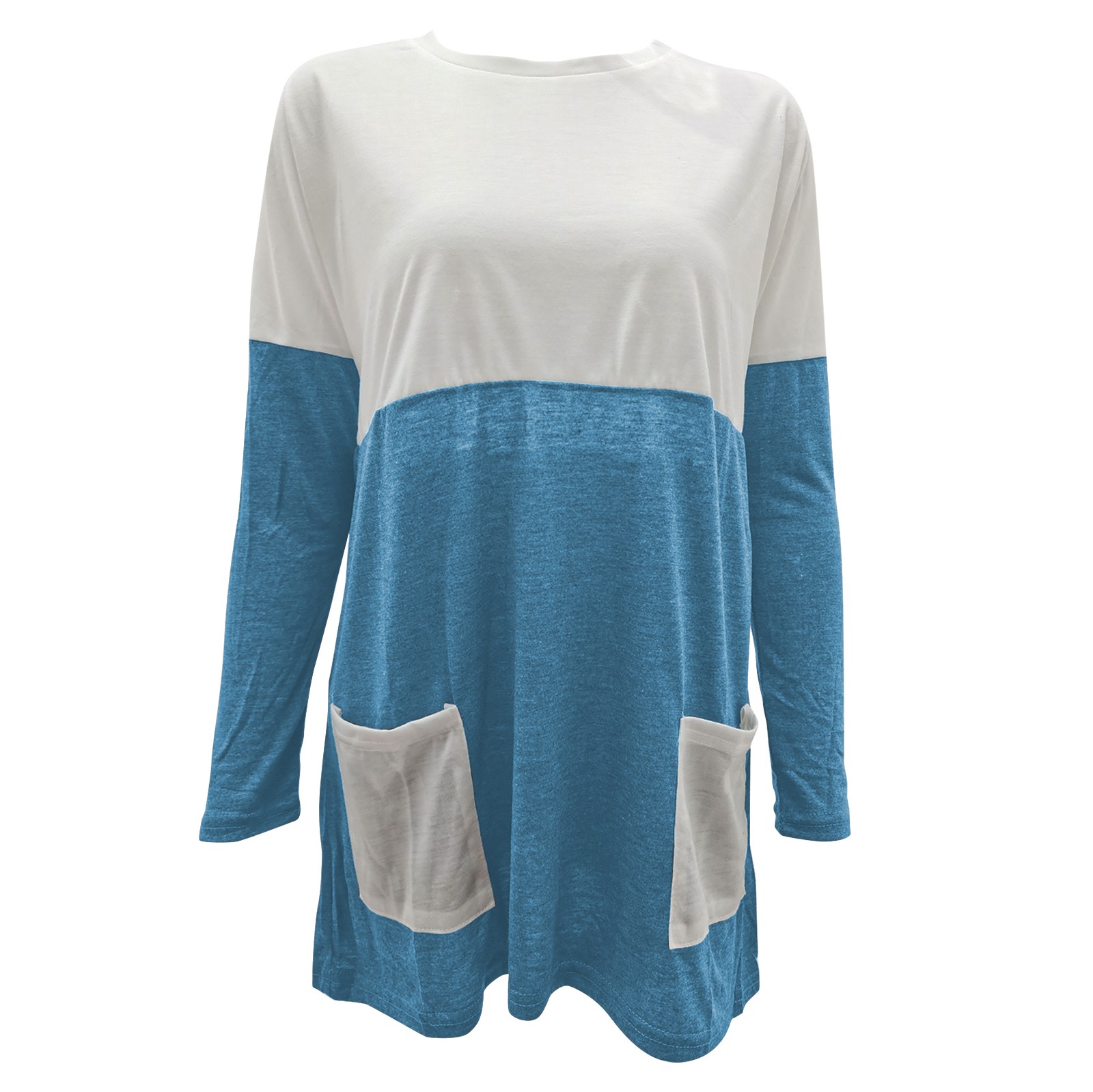 Женские модные повседневные Лоскутные свободные хлопковые топы с длинными рукавами и карманами и круглым вырезом