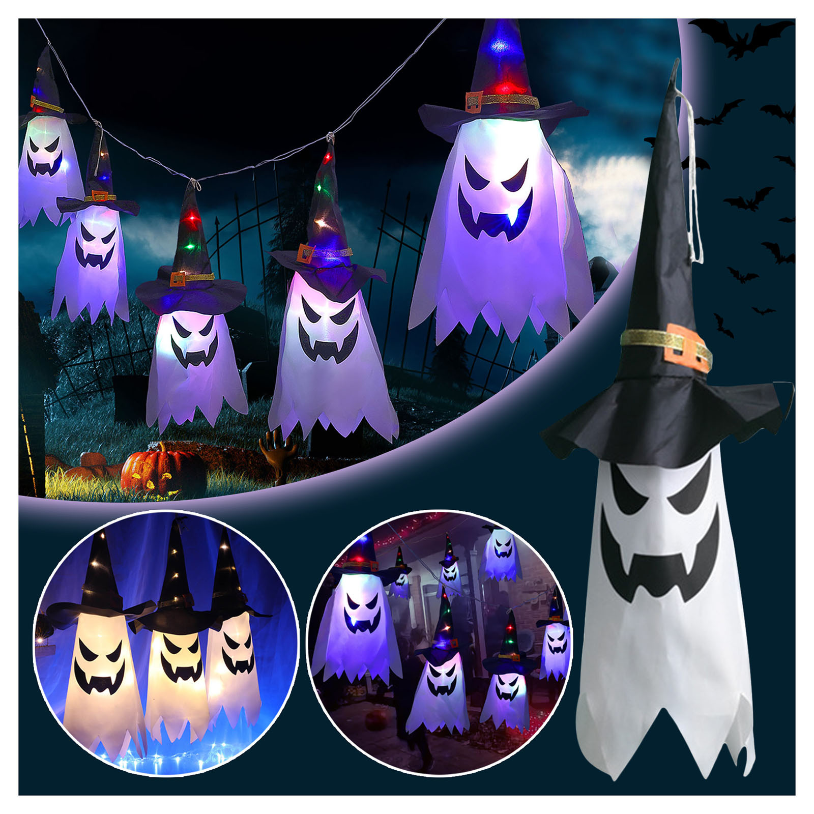 Уникальный призрак Хэллоуина Украшение шляпы: идеальное сочетание шляпа призрак и гирлянда света Светильник на Хэллоуин-единственный на рынке. Водонепроницаемая шляпа призрак Отличный светильник: не беспокойтесь о том, чтобы положить его на улицу. В Шляпа Призрак Хэллоуин использует материал с лучшим коэффициентом пропускания светильник и Не легко повредить, прочный и красивый. Каждая шляпа поставляется с десятью лампами, Достаточно яркий и теплый. 3 режима светильник Мигание: мигание, мерцание и постоянное включение, 3 вида режима вспышки на светильник Вы можете выбрать, наслаждайтесь разными режимами. Подходит для всех Случаи: шляпа призрак светильник 17 дюймов, может быть одета в помещении и на открытом воздухе. Вы можете повесить их Ваша комната добавит вечерние ощущения, или вы можете повесить их на садовое дерево Светильник на ваш двор.Спецификация: