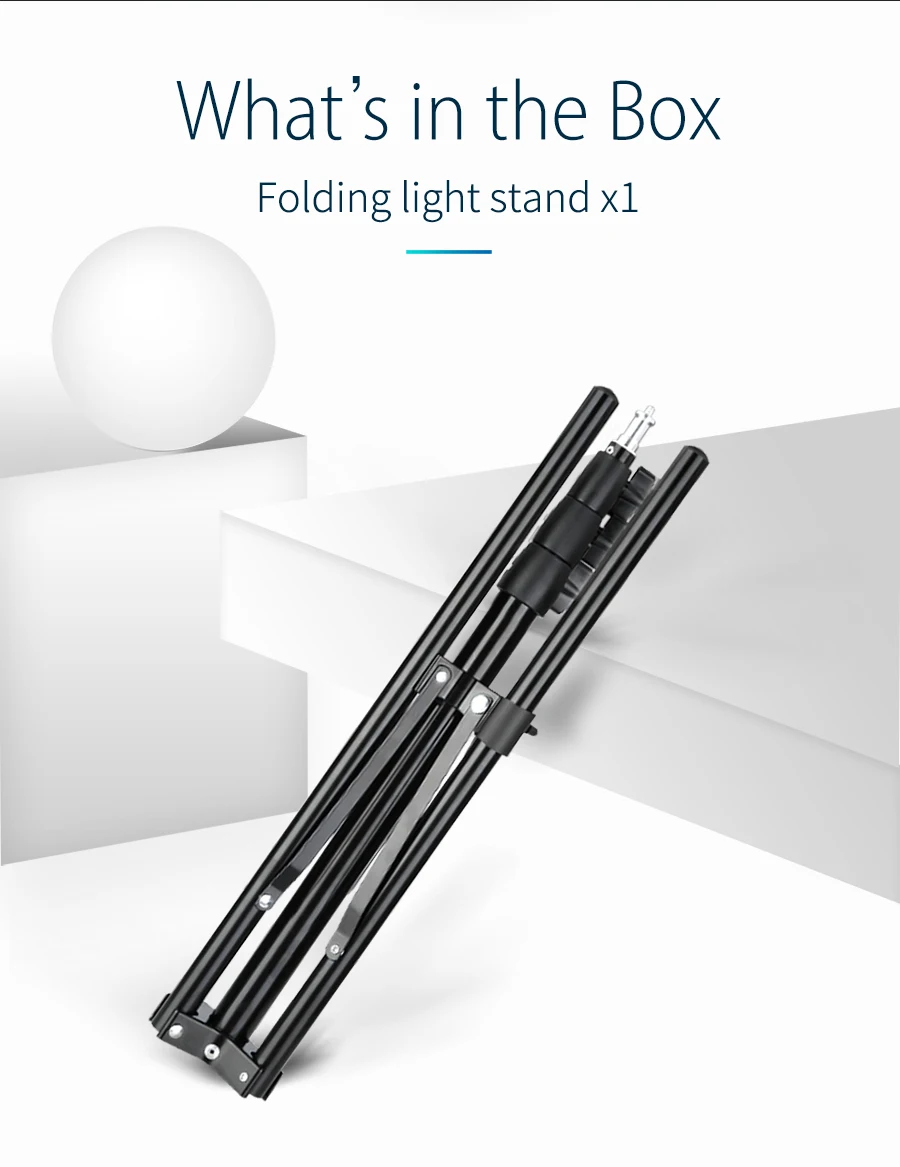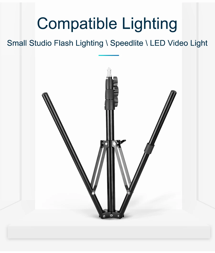 Описание:-Цвет: черный-Вес: 890 г-Максимальная высота 180 см, сложите до 53 см для удобства переноски.-Профессиональная качественная алюминиевая рама с черной атласной отделкой.-Простые быстросъемные рычаги обеспечивают быструю точную регулировку высоты.-Дополнительные широкоугольные следы с резиновыми наконечниками для большей стабильности.-Складная конструкция рамы для установки освещения и более удобного хранения. Совет: 140 ~ 150 см Посылка включает в себя:4 секции светильник стенд крутящийся складной