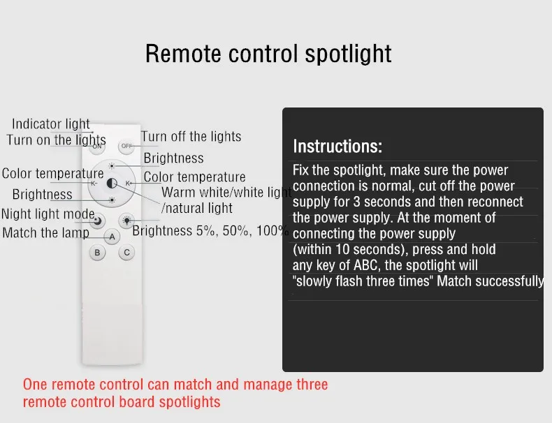 Зафиксируйте прожектор, убедитесь, что подключение к источнику питания нормальное, отключите источник питания в течение 3 секунд, а затем повторно подключите источник питания, нажмите и удерживайте любую кнопку ABC в момент включения питания (в течение 10 секунд), прожектор будет «медленно мигать три раза» успешно совпадать