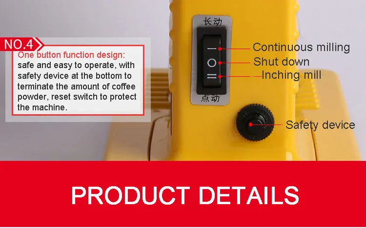 4. Конструкция функции одной кнопки: безопасный и простой в эксплуатации, с устройством безопасности в нижней части, чтобы прекратить количество кофейного порошка, переключатель сброса для защиты машины.