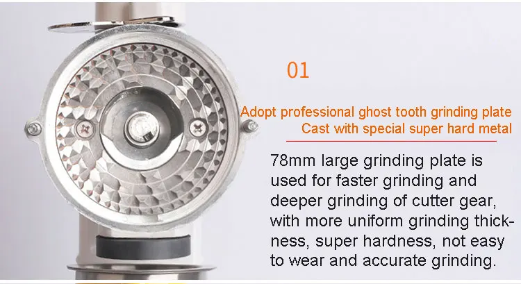 1. Он изготовлен из термообработанной экологически чистой легированной стали с твердостью Rockwell 55HRC и 78 мм шлифовальной пластины. Он быстрый и прочный.