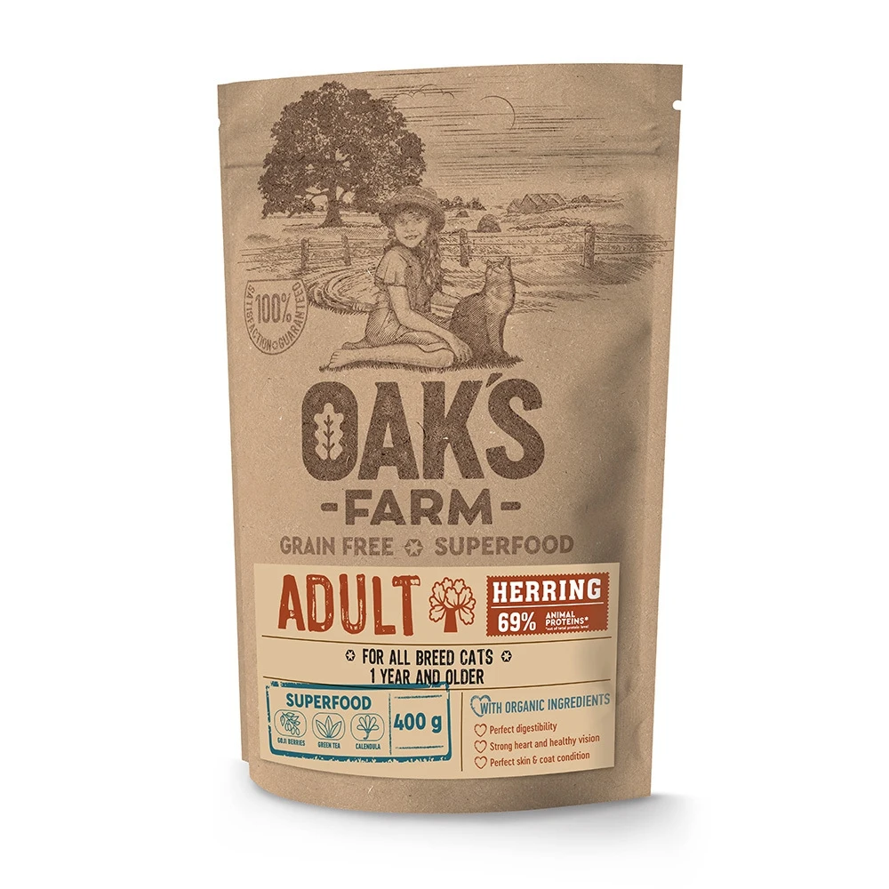 OAK’S FARM Беззерновой корм для взрослых кошек сельдь без зерна с сельдью для взрослых кошек — это полностью сбалансированный, гипоаллергенный корм класса Суперпремиум с суперпродуктом и органическими ингредиентами.