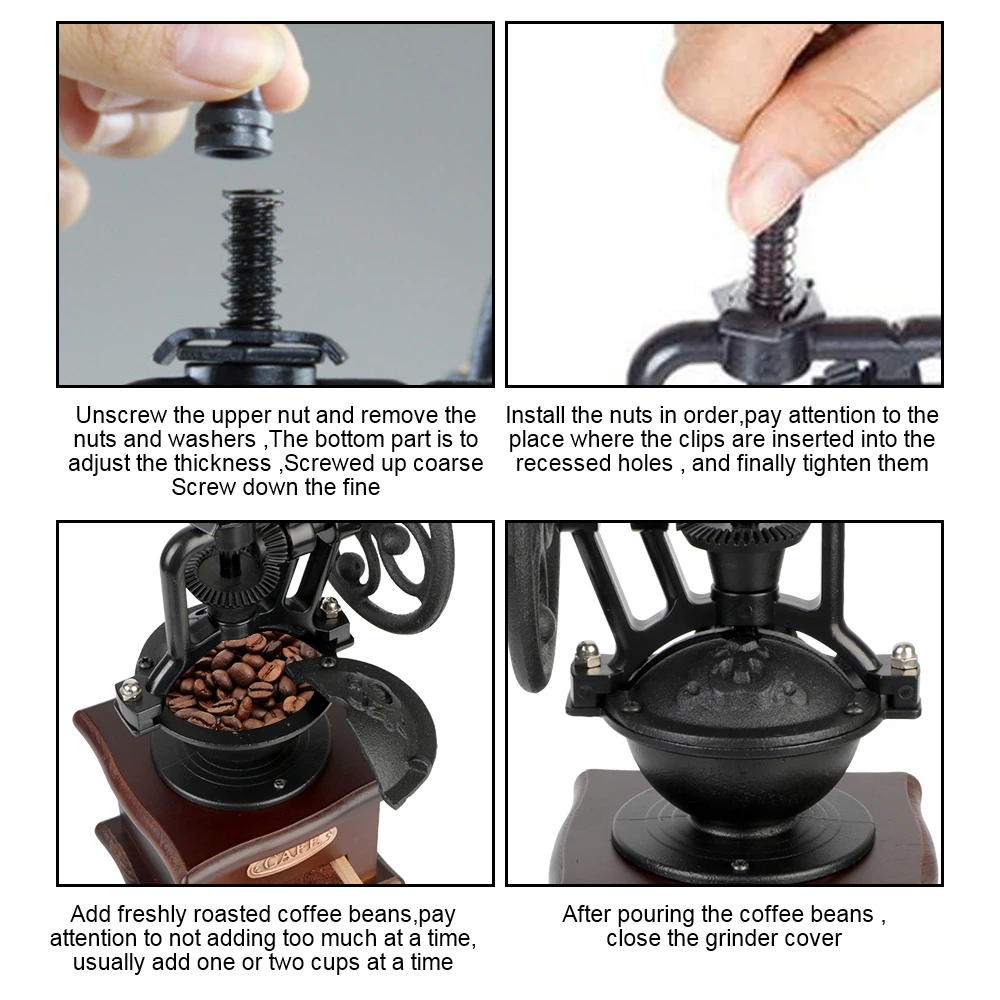 Особенности:Ретро-дизайн, доступен в домашних условиях для небольших украшений, стабильный чугунный корпус, тело не легко раскачивать при измельчении бобов.Винтажный стиль