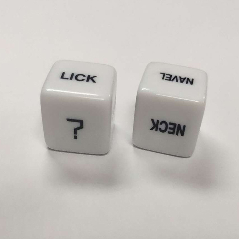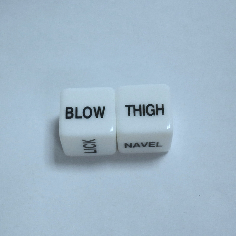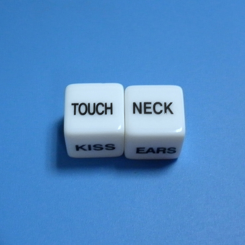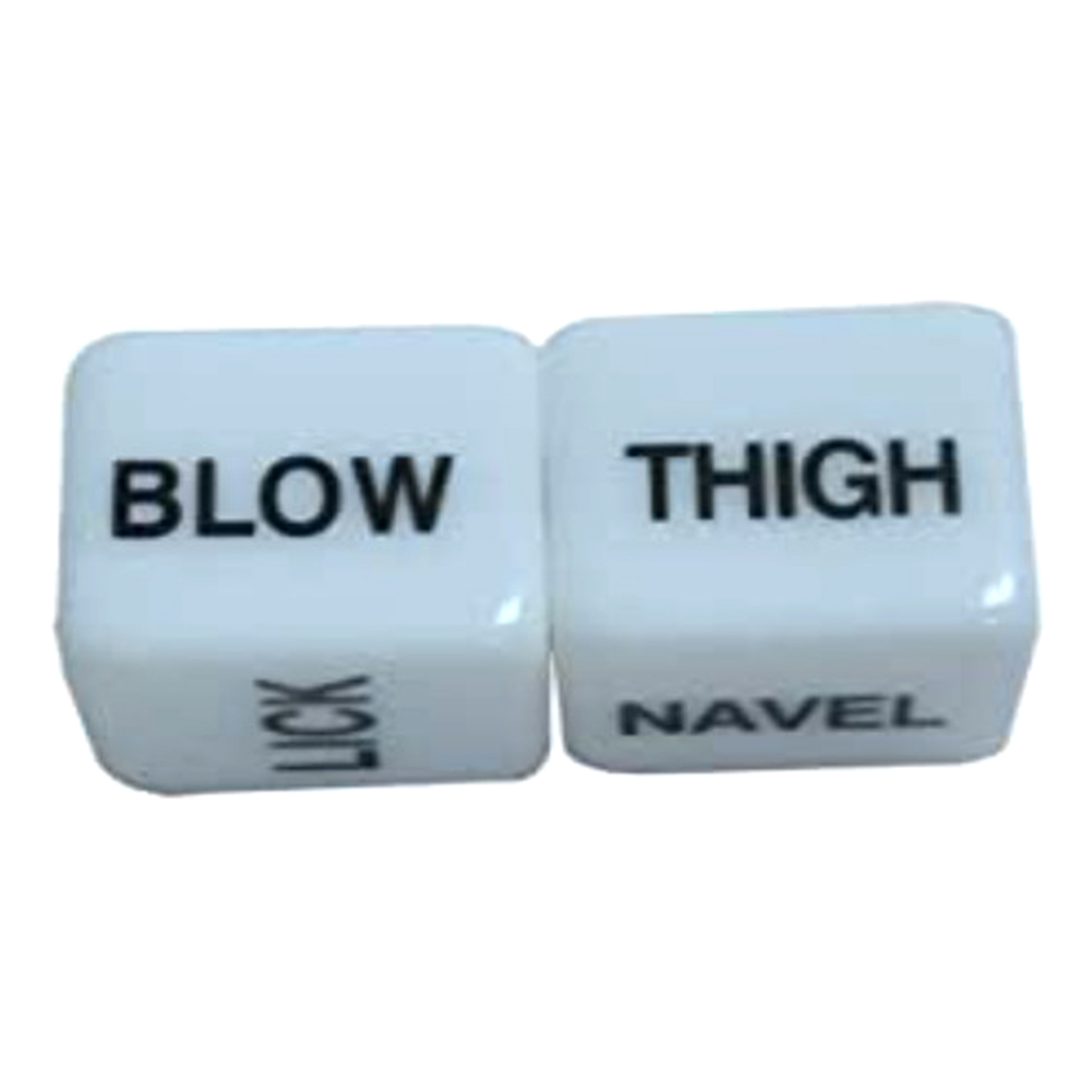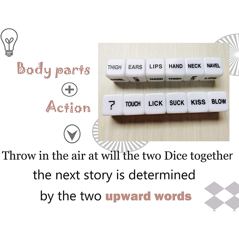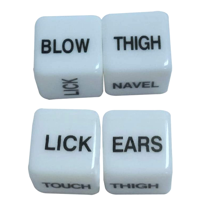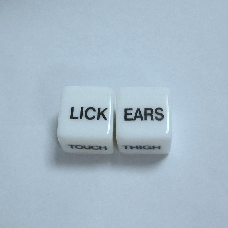 Две кости напечатаны с соответствующими словами о действии и частях, один из которых: выдувание, лижание, сосание, прикосновение, удар, кусание. Другое: ягодицы, пуговицы на животе, произвольный крой, бедра, руки,?
