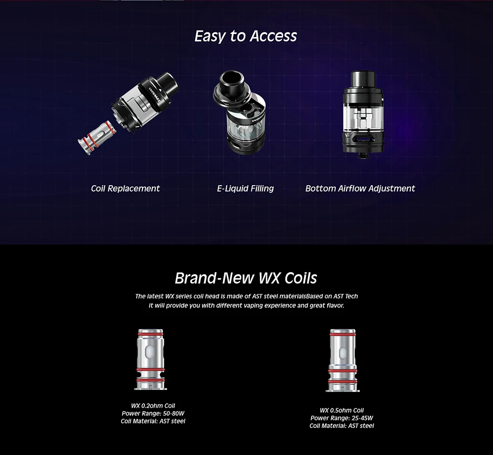 • WX 0.2ohm катушка: Диапазон мощности: 50-80W литая сталь