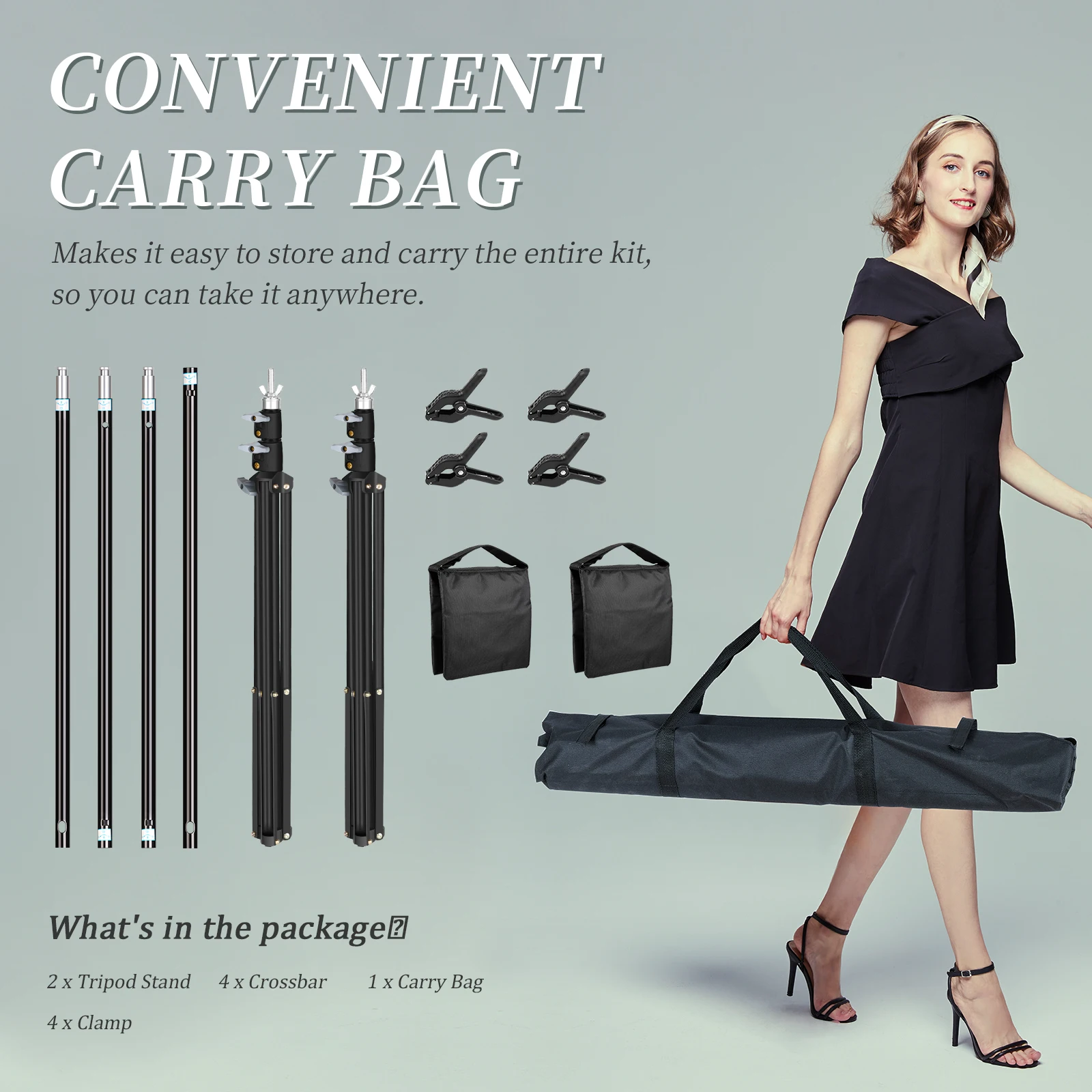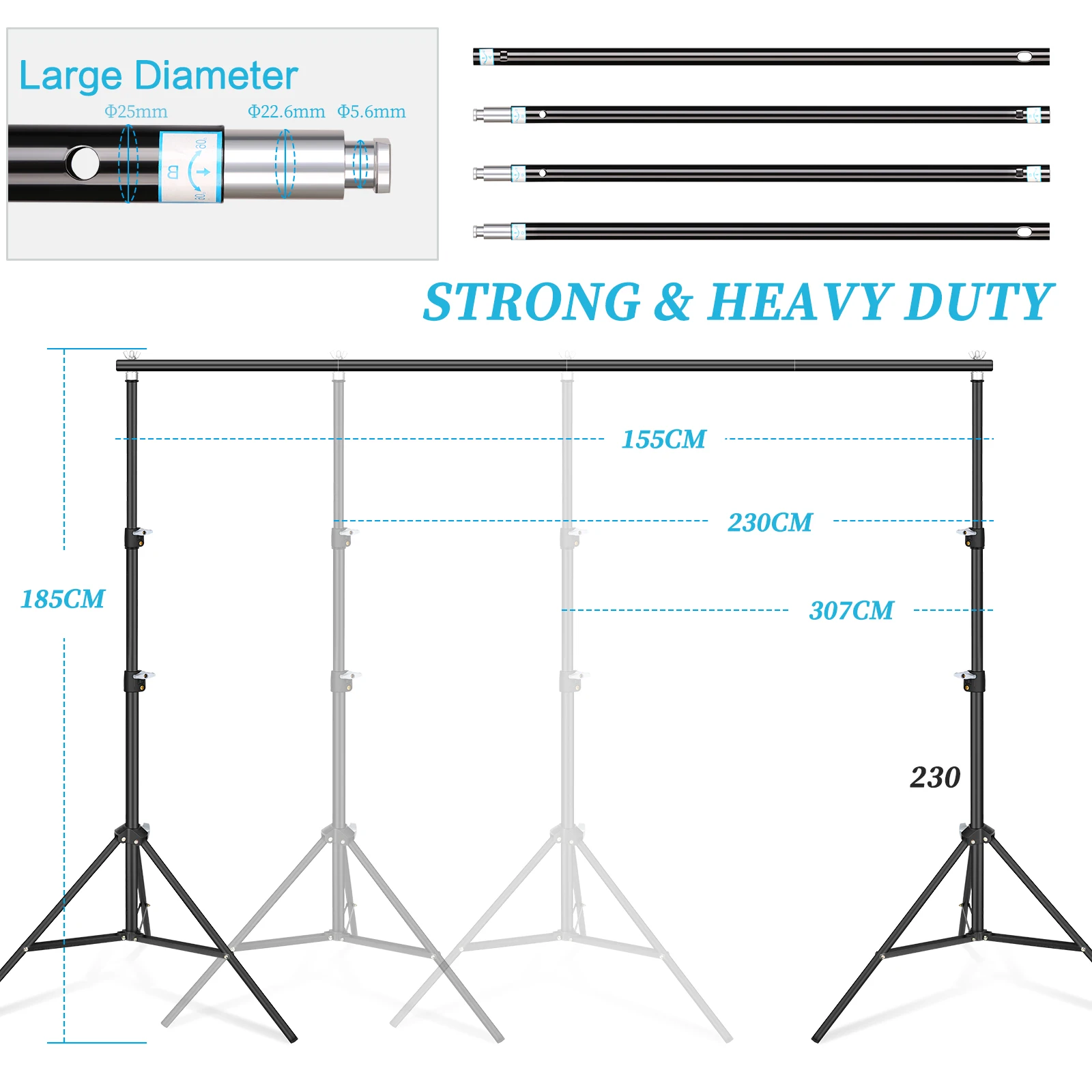Регулируемая подставка для фона: высота может быть отрегулировано от 2,3 футов до 6,5 футов); Ширина может быть отрегулировано от 4 футов до 10 футов. Простая установка, легко собирается и разбирается всего за несколько минут.