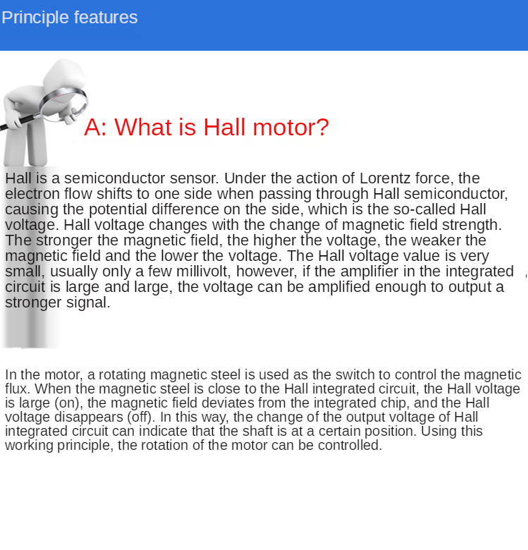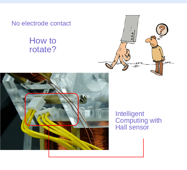 В двигателе вращающаяся магнитная сталь используется в качестве переключателя для управления Магнитным потоком. Когда магнитная сталь находится близко к интегральной цепи зала, напряжение Холла большое (ВКЛ), магнитное поле отклоняется от интегрированного чипа, и напряжение Холла исчезает (ВЫКЛ). Таким образом, изменение выходного напряжения интегрированной цепи Холла может указывать на то, что вал находится в определенном положении, которое может использоваться для управления вращением двигателя.