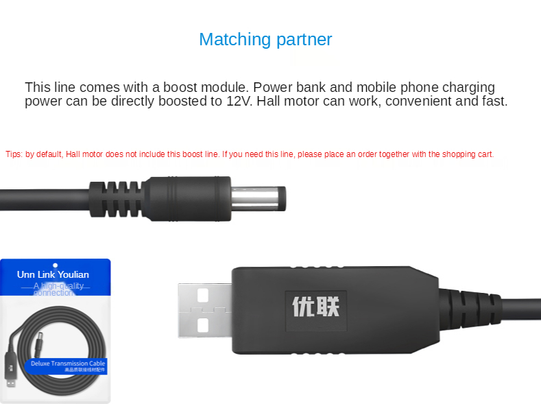 Этот кабель имеет модуль бустера. Зарядная мощность может быть непосредственно увеличена до 12 В, заряжая мощность зарядного устройства и мобильный телефон, а мотор Холла может работать удобно и быстро.
