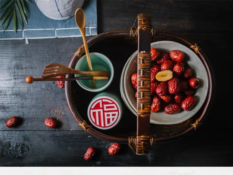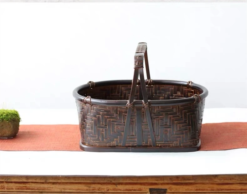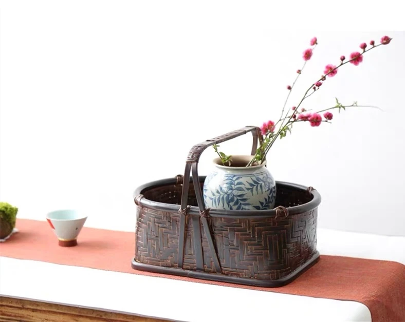 Hand-woven bamboo storage basket sundry fruit portable antique tea set storage basket indoor living room home decoration